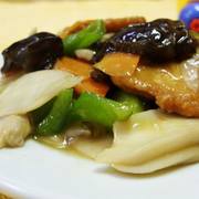 鸡腿菇、鸡脯肉、胡萝卜、青椒、鸡蛋、葱姜蒜、葵花油、淀粉、料酒、生抽、醋、盐、蚝油、鸡精。