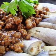 长茄子、肉末、葱、姜、蒜、食用油、鸡蛋、盐、糖、醋、鸡精、生抽。