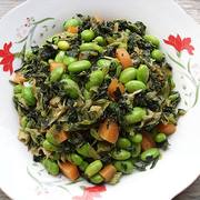 毛豆、梅干菜、胡萝卜、葱、蒜、食用油、盐、麻油。