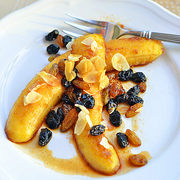 香蕉、黄油、白砂糖、黑葡萄干、白葡萄干、朗姆酒、杏仁片。