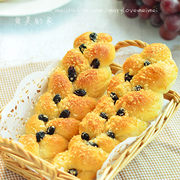 高筋面粉、水、酵母、细砂糖、干酵母、盐、水、鸡蛋、黄油、糖粉、低筋面粉、奶粉、无盐奶油、葡萄干、全蛋液。