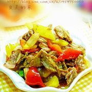 牛后腿肉、黄椒、红椒、洋葱、蚝油、生抽、料酒、白糖、盐、鸡精、淀粉、葱、姜。