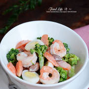 活虾、杏仁、西兰花、胡萝卜、鹌鹑蛋、丘比凯撒沙拉汁、食用油。