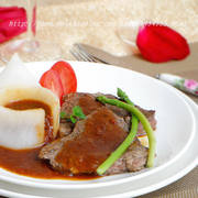 牛肉、白萝卜、小番茄、芦笋、橄榄油、食盐、黑胡椒碎、黑椒汁。
