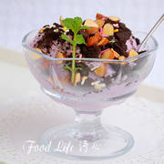 紫薯、白糖、牛奶、淡奶油、柠檬汁、奥利奥饼干碎、杏仁、朱古力糖针。