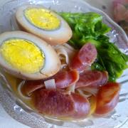 腊肠、卤鸡蛋、面条、青菜、盐。