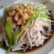 金针菇、芹菜、大蒜、黑芝麻油、生抽、白糖、香醋。