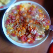剩米饭、鸡蛋、火腿、玉米粒、洋葱、胡萝卜、杏鲍菇、盐、番茄酱。