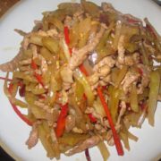 瘦肉、榨菜、干辣椒、红辣椒、姜、蒜、盐、酱油、料酒、鸡精、香油。