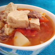 牛肉、土豆、西红柿、豆腐、葱段、料酒、胡椒粉、姜粉、盐、鸡精。