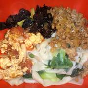 普通面粉、猪绞肉、土豆、蒜苗、鸡蛋、西红柿、木耳、大蒜、姜、葱、小青菜、食用油、盐、蚝油、蕃茄酱、老抽、白醋、鸡精。