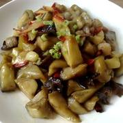茄子、大蒜、猪肉片、干红辣椒、红萝卜、木耳、葱末、食用油、盐、蚝油、糖、味精。