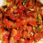 番茄、圆白菜、蒜头、香菇、小白菜、牛肉、葱花、蛋清、盐、糖。