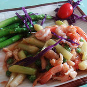 芦笋、鸡脯、虾仁、豌豆、蚝油、盐、味精、淀粉。