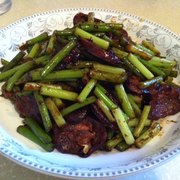 四川麻辣腊肠、蒜苔、葱、盐、老抽、生抽、油、淀粉。
