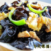 干木耳、鸡蛋、瘦肉、大蒜、青椒、油、盐、鸡精。