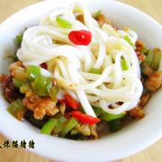 面条、青椒、红椒、瘦肉、小葱、大蒜、油、盐、海天辣黄豆酱。