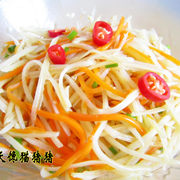 土豆、胡萝卜、小葱、大蒜、香油、辣椒油、鸡精、鲜贝露、醋、白砂糖、盐。