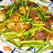 鹌鹑蛋、香肠、蒜苔、淀粉、盐。