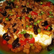 内酯豆腐、肉末、木耳、香菇、烤麸、青豆、葱、姜、红椒、淀粉、甜面酱、番茄酱、料酒、盐、糖、十三香。