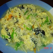 鸡蛋、金针菇、豆芽、木耳、南瓜、青椒、葱、料酒、糖、白醋、盐。