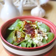 芹菜叶、面粉、温水、包菜、葱、大蒜、食用油、干辣椒面、食盐、鸡精、酱油、香醋。