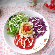 紫甘兰、生菜、圣女果、杏仁片、腰果、橄榄油、沙拉酱、胡椒粉。