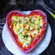 饼底:面粉、去皮熟紫薯、干酵母、温水、食盐、内馅:甜玉米粒、马苏里拉奶酪、火腿、青椒、红椒、口蘑、披萨酱。