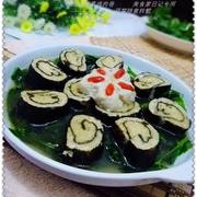 鸡胸肉、豌豆尖、寿司紫菜、料酒、蚝油、盐、鸡精、胡椒粉、糖。