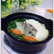 白菜、豆腐、蟹味菇、豌豆尖、胡萝卜、葱、姜、鸡汤、盐、胡椒粉、香油。