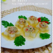 白萝卜、猪肉馅、黄彩椒、红彩椒、榨菜丁、火腿丁、葱沫、姜沫、香菜叶、植物油、蚝油、生抽、绍酒、糖、水淀粉、高汤。