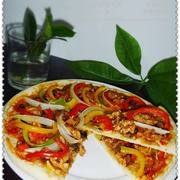 面粉、猪里脊、红彩椒丝、黄彩椒丝、青椒丝、葱头丝、水、蘑菇、葱头碎、彩椒碎、烤肉料、披萨草、孜然粉、番茄沙司、蒜末。