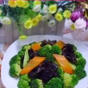西兰花、木耳、胡萝卜、食盐、糖、生抽、醋、鸡精、香油。