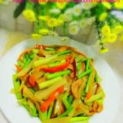 蒜薹、芹菜、土豆、玉米肠、干辣椒、葱、生抽、盐、味精、糖、醋、香油、姜。