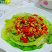 球生菜、红彩椒丁、生抽、糖、蚝油。