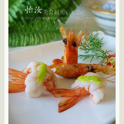 大明虾、蔬菜配饰、青芥末、甜辣酱、盐。