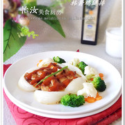 鸡小腿、西兰花、白色菜花、葱头片、胡萝卜片、姜丝、绍酒、蚝油、糖、盐、橄榄油、韩式辣酱。