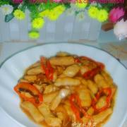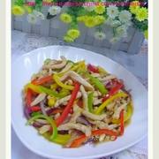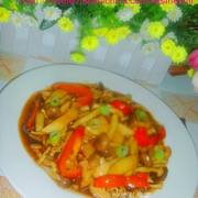 内鸡胸肉、青椒、红椒、黄椒、葱头、生抽、鲍汁、糖、盐。