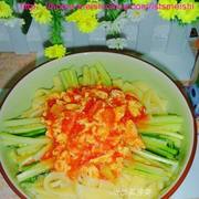 面粉、西红柿、鸡蛋、黄瓜、葱、姜、小香葱、盐、生抽、糖、鸡精。