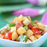 莲藕、火腿、青椒、豆腐干、老干妈辣酱、酱油、盐、红椒。