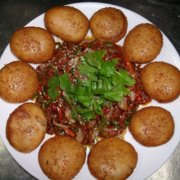 小饼、牛肉、黄瓜、洋葱、青椒、红椒、香菜、油、盐、酱油、鸡精、孜然粉、料酒。