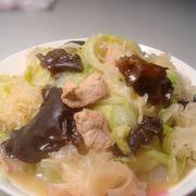 猪肉、干木耳、银耳、姜、青菜、葱、植物油、盐、料酒、生抽。