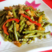 豇豆、南瓜、红辣椒、猪肉、盐、料酒、鸡精、生抽、高汤、水淀粉、甜面酱、葱、姜、蒜、食用油。