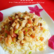 虾仁、鸡肉丁、香菇丁、蕃茄丁、蛋、白饭、蚝油、鸡精、盐、太白粉、水、色拉油。