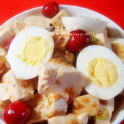 鸡蛋、嫩豆腐、蒜、葱花、樱桃、盐、酱油、味精、麻油。