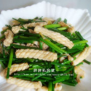 鱿鱼、韭菜苔、葱、姜、花生油、盐、料酒。