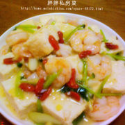 虾仁、豆腐、枸杞、葱、姜、蒜、花生油、料酒、盐、水淀粉、胡椒粉。