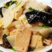 木耳、冻豆腐、萝卜、葱、姜、蒜、花生油、盐、生抽、味精、香菜、香油。
