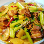 红烧肉、白萝卜、土豆、芹菜、葱、姜、蒜、香菜、花生油、盐、味精。