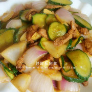 黄瓜、猪肉、洋葱、葱、姜、蒜、料酒、酱油、盐、白糖、味精、花生油。